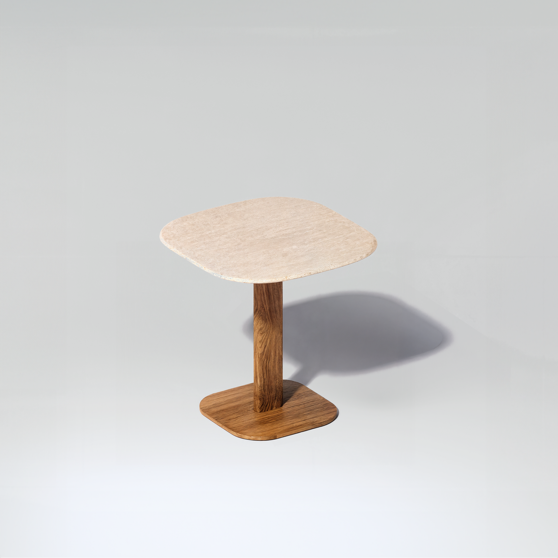 Orma pairs a soft, organic stone top with a solid teak pedestal, creating a subtle contrast between mineral and wood. A sculptural accent for refined spaces.