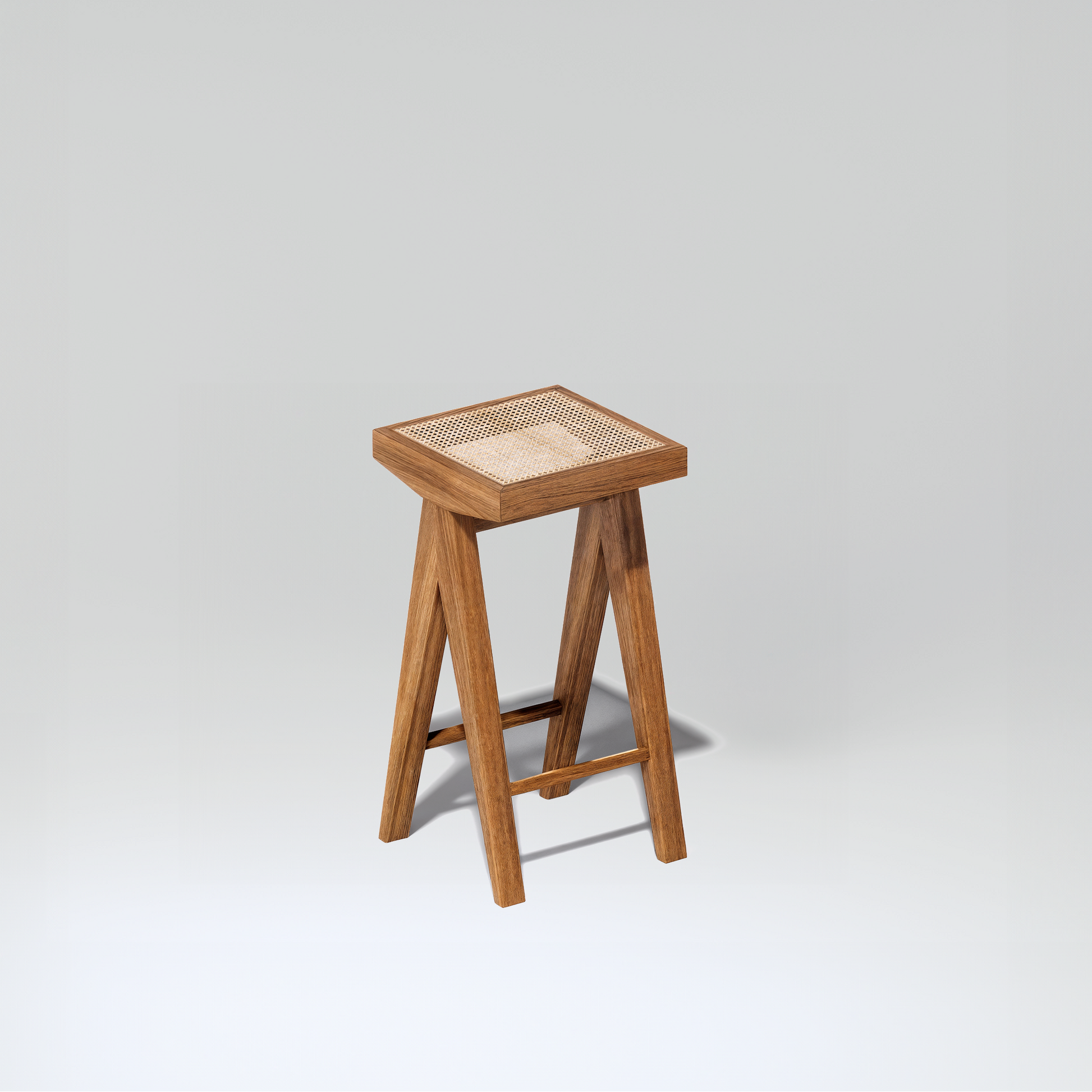 Tress is a tall, architectural stool featuring a woven cane seat and solid teak legs. Designed for bar counters where materiality and craftsmanship take center stage.